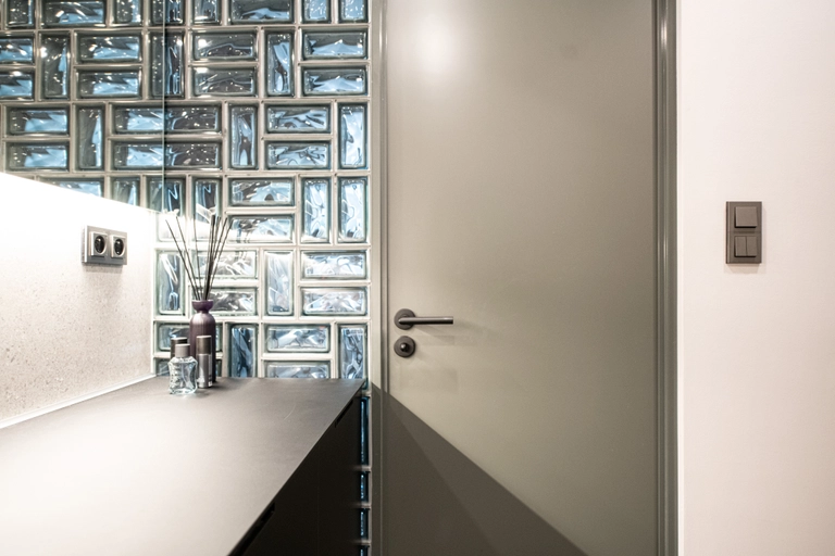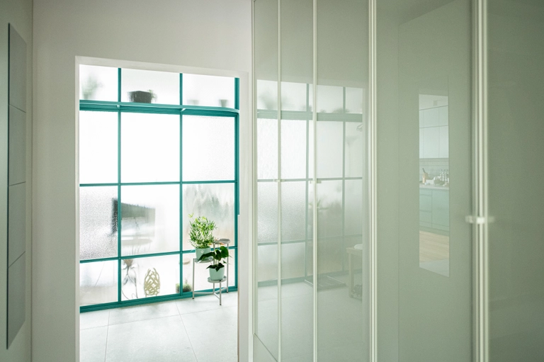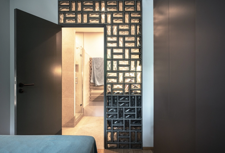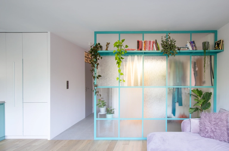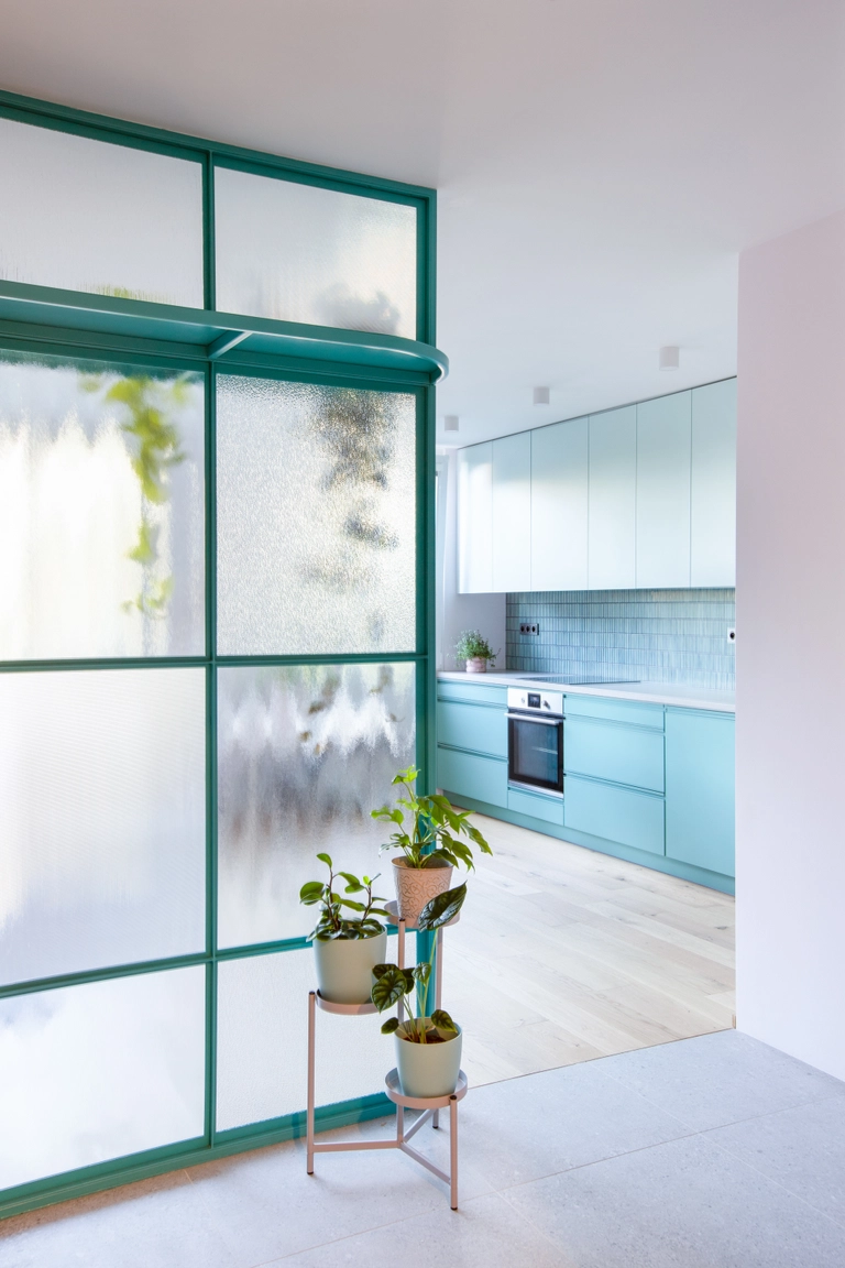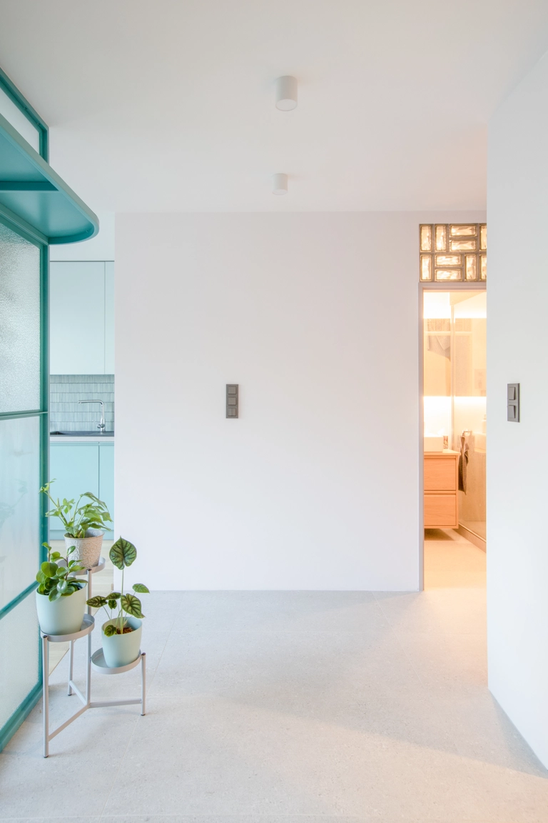 Hlavním setkávacím místem je prostorný obývací pokoj s kuchyňským koutem, který vznikl odstraněním příčky a propojením obou místností. Objem vysokých skříní kuchyně je skryt do niky vedle koupelny a prostor tak zůstává otevřený a čistý. Byt je celkově světlý, pokoje jsou orientovány na východ a západ. Denní světlo se do středu dispozice dostává díky luxferovým výplním a prosklené příčce mezi obývacím pokojem a vstupní chodbou. Skleněná příčka je zároveň výrazným interiérovým prvkem. Ocelová konstrukce integruje šatní tyč v předsíni a na ni navazuje police, která probíhá až na druhou stranu stěny do obývacího pokoje. Konstrukce je vyplněna tabulkami tlačeného skla s různými vzory.
