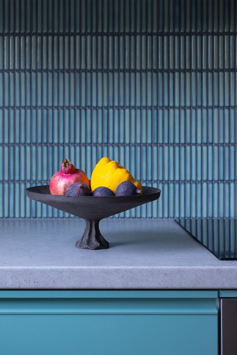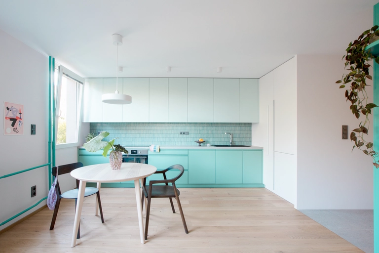 Stavebně spjaté materiály a zařízení jsou jednotné pro celý byt, v mobiliáři a barevnosti se ale obě části liší podle představ uživatelů. Pro obývací část a ložnici byla hlavním motivem tyrkysová barva, kterou doplňují odstíny růžové a dubová dýha. Druhá část bytu se pohybuje v odstínech šedé barvy. Atypický vestavný nábytek jsme z ekonomických důvodů řešili úpravami typových prvků – zakoupené korpusy a regály byly doplněny truhlářsky vyrobenými komponenty (doměrky, korpusy, záda skříní), aby odpovídaly konkrétním rozměrům a požadavkům.
