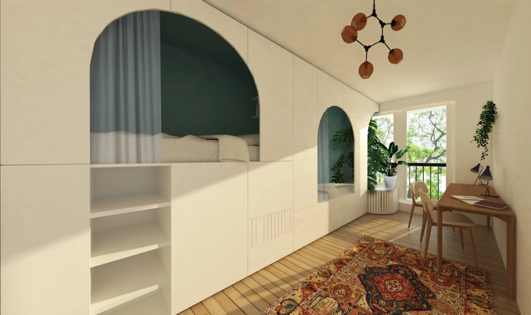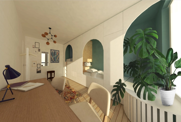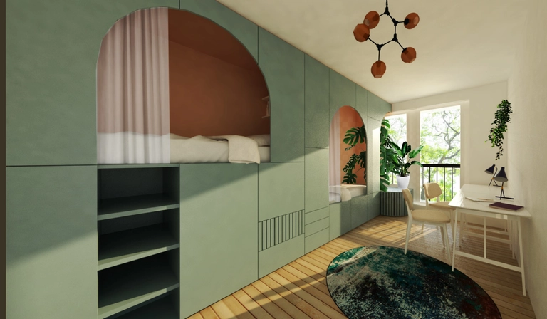 Pod postelemi se nachází úložné prostory. U okna je navržen rozšířený parapet, který může sloužit jako sezení nebo místo pro umístění květin. Nábytková stěna pojme většinu funkcí potřebného nábytku, což umožňuje zbytek prostoru ponechat volný.