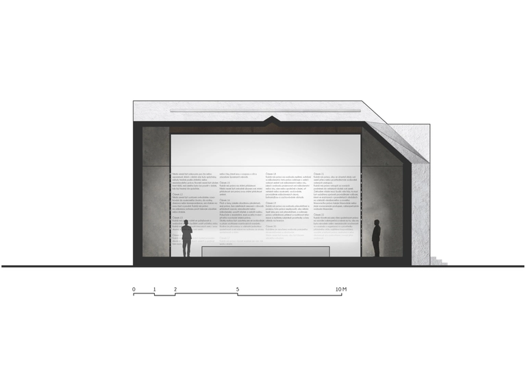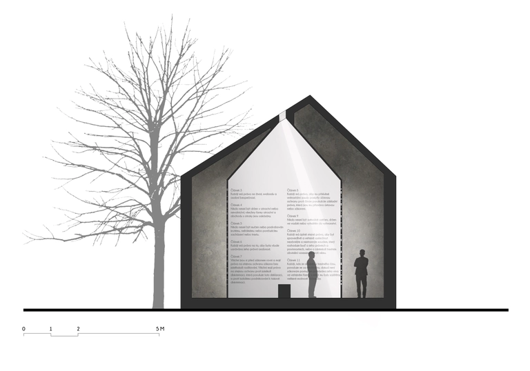 Návštěvníci by prošli dlouhou chodbou, až by se ocitli ve světlé, dobře osvětlené místnosti, která trochu připomíná kapli. Až nyní je možné si uvědomit, že text, kolem kterého prošli, ale nedokázali jej přečíst, je “Všeobecná deklarace lidských práv”. Byl to jeden z textů, ke kterým měl Jan Palach blízký vztah. Světlá místnost poskytuje návštěvníkům příležitost k zamyšlení nad Palachovým obětováním života, dopadem jeho činu a nad důležitostí svobody a samotného textu v kontextu současných událostí.
