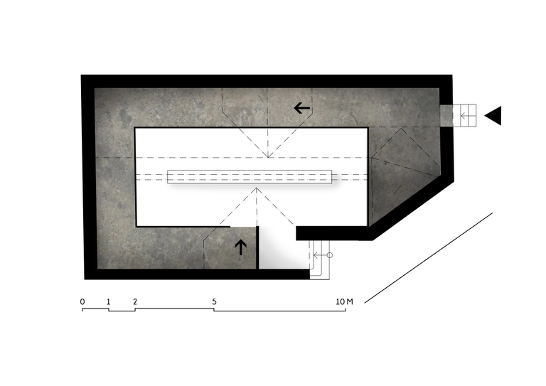 Pro vstup do objektu jsme navrhly úzký průchod ve štítové stěně domu, kterým by se návštěvníci dostali do tmavé, vysoké chodby. Prostor by působil na člověka vzkličujícím dojmem, jediné světlo by procházelo skrz písmena perforovaná v plechové stěně. Text však není jednodušše srozumitelný, protože je zrcadlově. Skrz písmena by byl vidět světlý prostor uvnitř domu. Tato část návrhu symbolizuje dobu, ve které Jan Palach žil. Omezenou svobodu, cenzuru médií a naději a odhodlání ke změně.