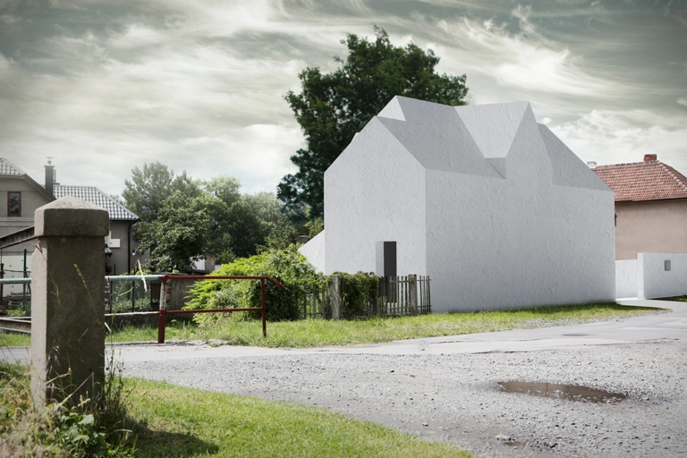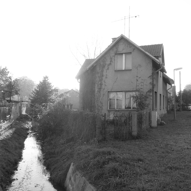 Dům se nachází ve Všetatech, malém městě poblíž Prahy. Pozemek má tvar ostrého trojúhelníku, který je sevřen mezi ulicí a potokem. Vstup na pozemek je umístěn v nejostřejším rohu, těsně před křižovatkou ulic. Od brány vede úzká přístupová cesta podél potoka k hlavnímu vchodu do domu a dále do zahrady. Samotné místo a umístění domu na nás silně působilo, rozhodly jsme se tedy zachovat jeho autenticitu, ponechat vnější objem domu a vytvořit symbolickou introverzi uvnitř.